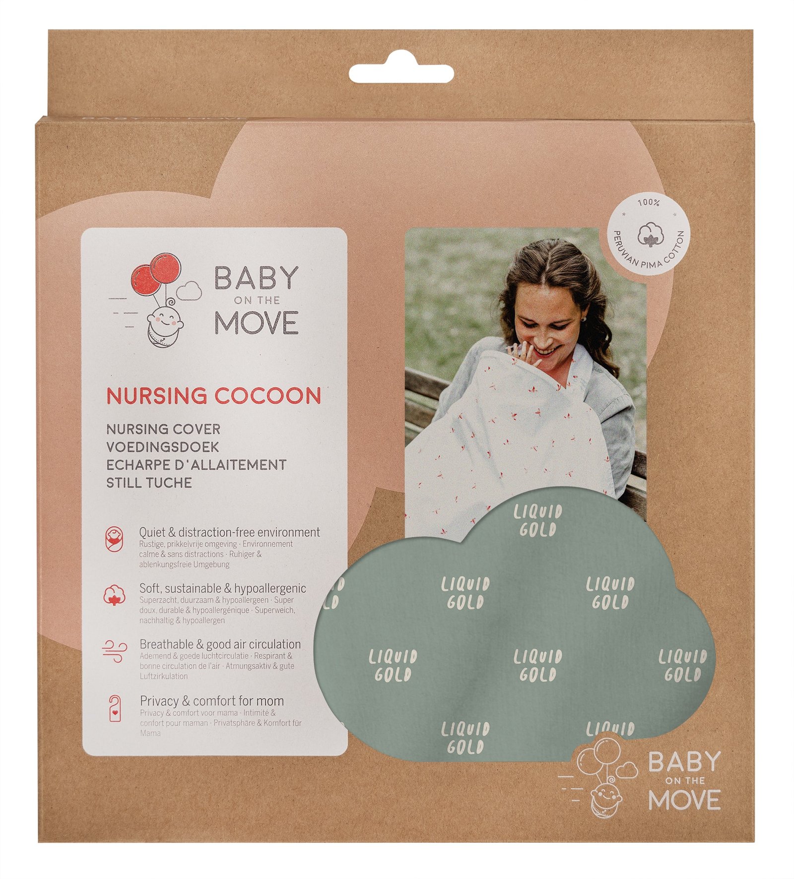 The breastfeeding cocoon is made of 100% handpicked Peruvian Pima cotton which contains exceptionally long cotton fibers. As a result, our cover feels luxuriously soft and it is also durable, breathable and hypoallergenic. Exactly the qualities we want for our little ones.
