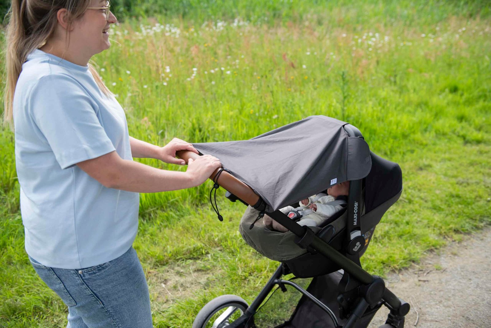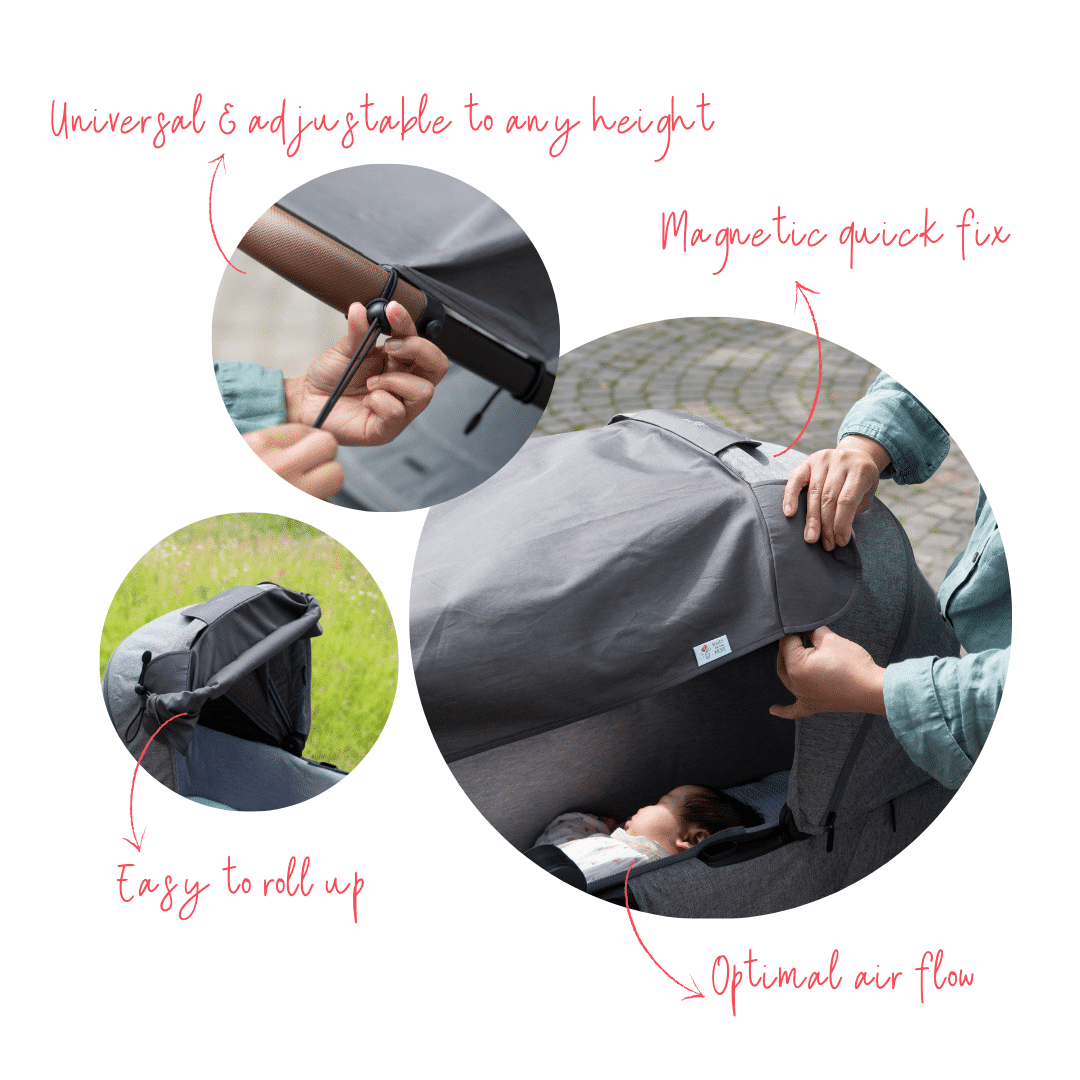 Our Sun Cocoon is the ultimate solution for protecting your little one from harmful UV rays while on the go. The universal UV sunshade fits any pram and blocks >97% of UV rays without any chemical coating, making it the essential protection for your baby’s delicate skin. Made from 100% breathable Pima Cotton, the Sun Cocoon’s open design ensures optimal air flow, keeping your baby cool and comfortable, helping prevent overheating. Setting up is hassle-free thanks to its quick-fix magnets and easy roll-up system. Enjoy peace of mind with the Sun Cocoon, wherever your adventures take you!